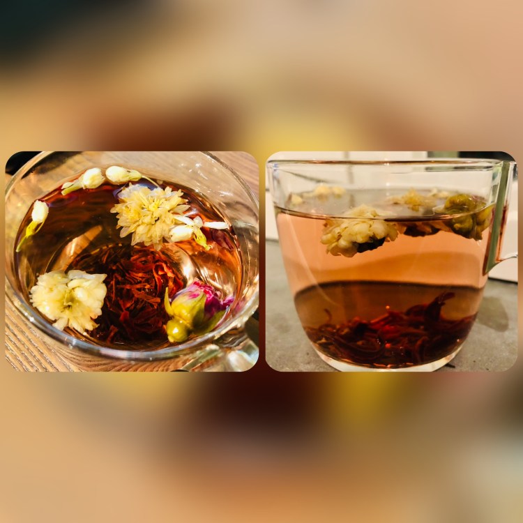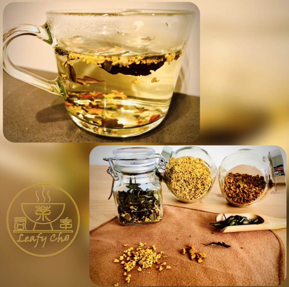 White leafy tea mix with slight tumeric and osmanthus aroma